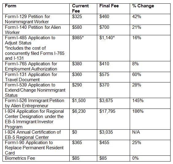 Fees for employment-based petitions and applications will rise by an average of 21%, though increases for some filings - notably, Form I-129 nonimmigrant worker petitions and EB-5 immigrant investor cases - will be significantly higher. There will be no increase in the premium processing fee.