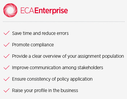 ECAEnterprise, the software service chosen by many of the world's multinational companies to run their mobility programmes, is an Assignment Management System that enables mobility teams to automate the most laborious manual activities and tasks across the assignment lifecycle, at the same time promoting consistency and standardisation of approaches.