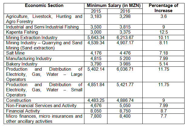 Labor authorities have set new minimum wages for several economic sectors. Sectors such as production and distribution of electricity, gas, water and the mining industry were increased by 12.5%, 11.75% and 10.11%, respectively. The new wage levels apply retroactively from April 1, 2016.