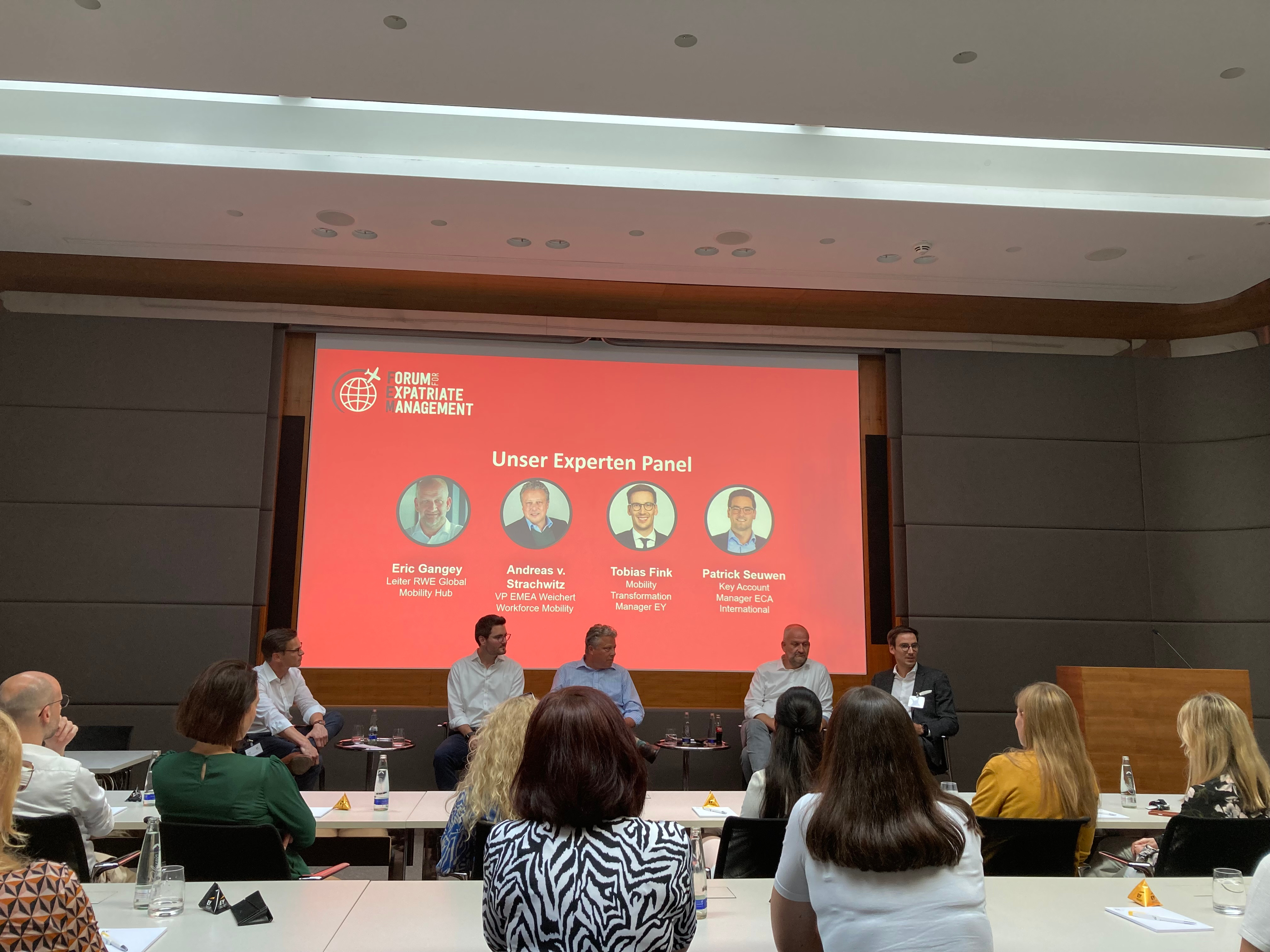 The panel discussion featured expert speakers from various reputable organizations. Eric Gangey, Head of RWE Global Mobility Hub, Andreas Strachwitz, Vice President EMEA of Weichert Workforce Mobility, Tobias Fink, Mobility Transformation Manager of EY, and Patrick Seuwen, Key Account Manager of ECA International, all shared their insights and expertise on the topic.