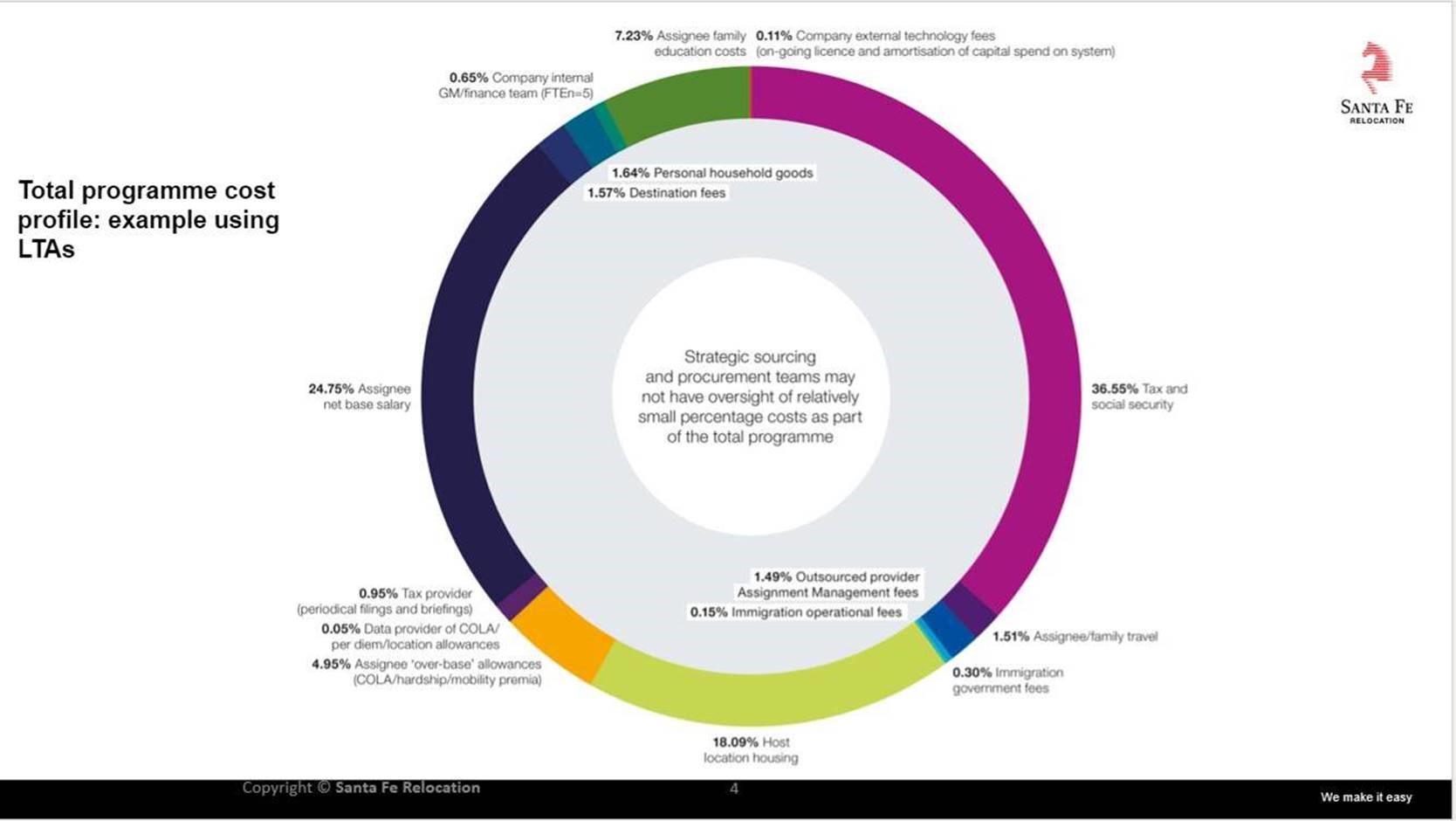 - Direct external costs such as suppliers as Santa Fe, any RMC such as SIRVA, CARTUS or BGRS, or specialists such as Dwellworks or Fragomen or any of the Big 4. That cost is easy to identify as it is external. However, it represents a fraction of the total pie. For example, if Santa Fe moving costs for a customer are €5m a year, say, they represent about 1.6% of the total program costs, which means that the global mobility program costs are about €312m. So, one (read procurement) can of course save 10% on the moving costs, but these are only €500k out of €300m, i.e. a very small saving out of a very big pie.