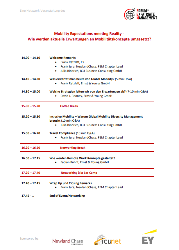 With presentations from FEM, ICU Business Consulting, NewlandChase and Ernst &Young, we will shed light on mobility concepts from various aspects and want to discuss them together with your expertise in a constructive and action-oriented manner.
