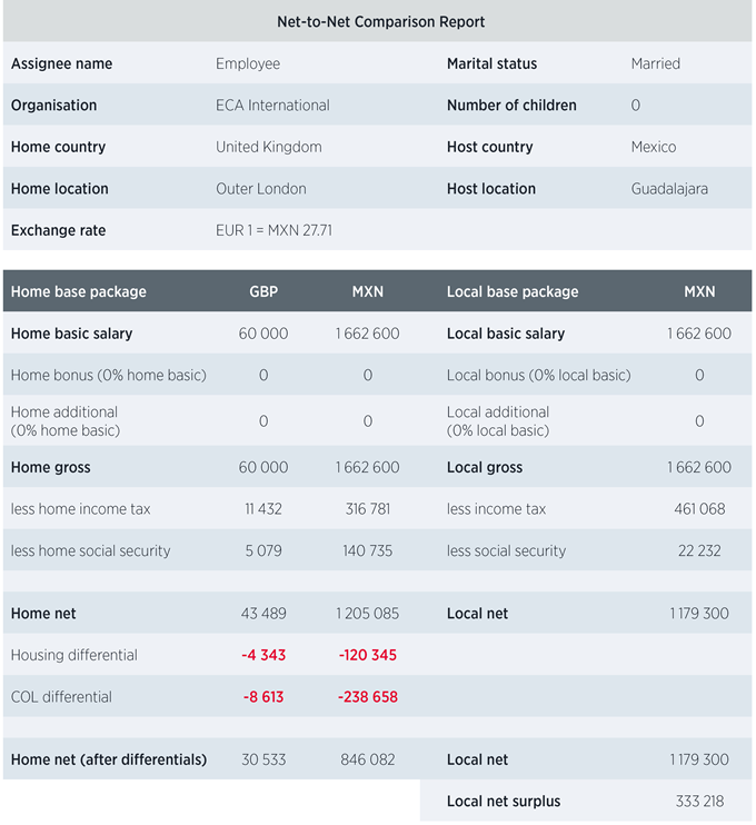 Offering an international flexible remote working policy can potentially be a great way to retain and attract talent, but – among other obstacles – deciding how to pay international remote workers can clearly be a tricky balancing act and may need to be considered carefully on a case-by-case basis. Net-to-net comparisons are indispensable for testing out the viability of each pay approach in each case, and with ECA’s Net-to-Net Calculator each scenario can be run in just a couple of minutes.